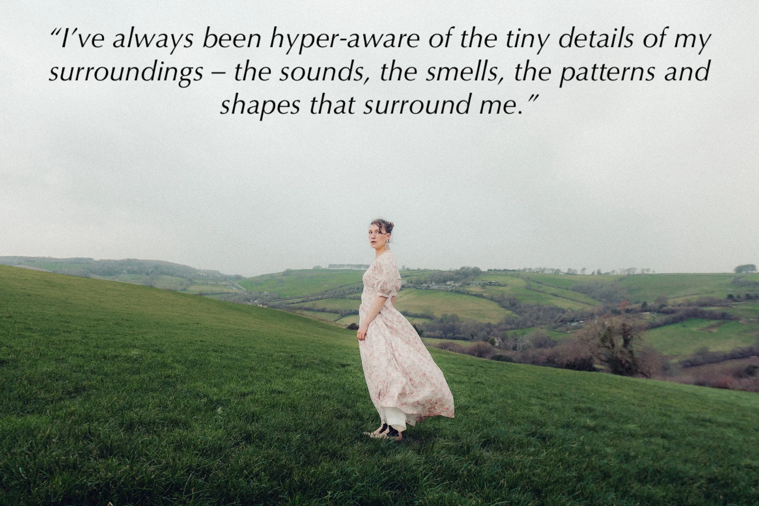 “I’ve always been hyper-aware of the tiny details of my surroundings – the sounds, the smells, the patterns and shapes that surround me. As a child I used to collect tiny objects and found treasures in a shoebox, and I would record the sounds of my everyday environment: my brother’s asthmatic breathing, the sound of a hairdryer, the creak of our squeaky floorboards in my childhood home. This is how I made sense of the bigger picture, I think. It’s still how I make sense of my world now, and this shapes my music. I think there is a huge richness in being a permeable being, a porous creature who is open to the world. And if you know your values and are grounded in something good, something sustainable, I like to think that this openness is my rebellious act against a world of AI, and profit-driven markets: to insist on being soft, on being a human in community with the world around me. This is how my sound has been shaped by the ebb and flow of the North Sea, the melodies of my dad’s humming in the morning as he opened the windows and how my voice feels like a continuous translation of every experience that moves through me.”